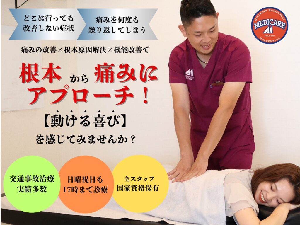 交通事故に遭った際、適切な治療を受ける場所がわからずお困りの方へ。当院では、患者様一人ひとりに合わせた治療プランをご提案し、痛みの根本解決を目指しています。交通事故による怪我は、外見には表れにくいケースも多く、早期の専門的な対応が重要です。当院では、痛みの状態を細かく診断し、ハイボルテージ治療により適切な箇所を重点的にケア。さらに、手技による施術で痛みの変化をすぐに確認できます。また、交通事故の示談交渉に強い弁護士との提携により、治療だけではなく、法律のサポートも受けられる体制を整えています。安心して治療に専念できる環境を提供いたしますので、お困りの際はぜひご相談ください。